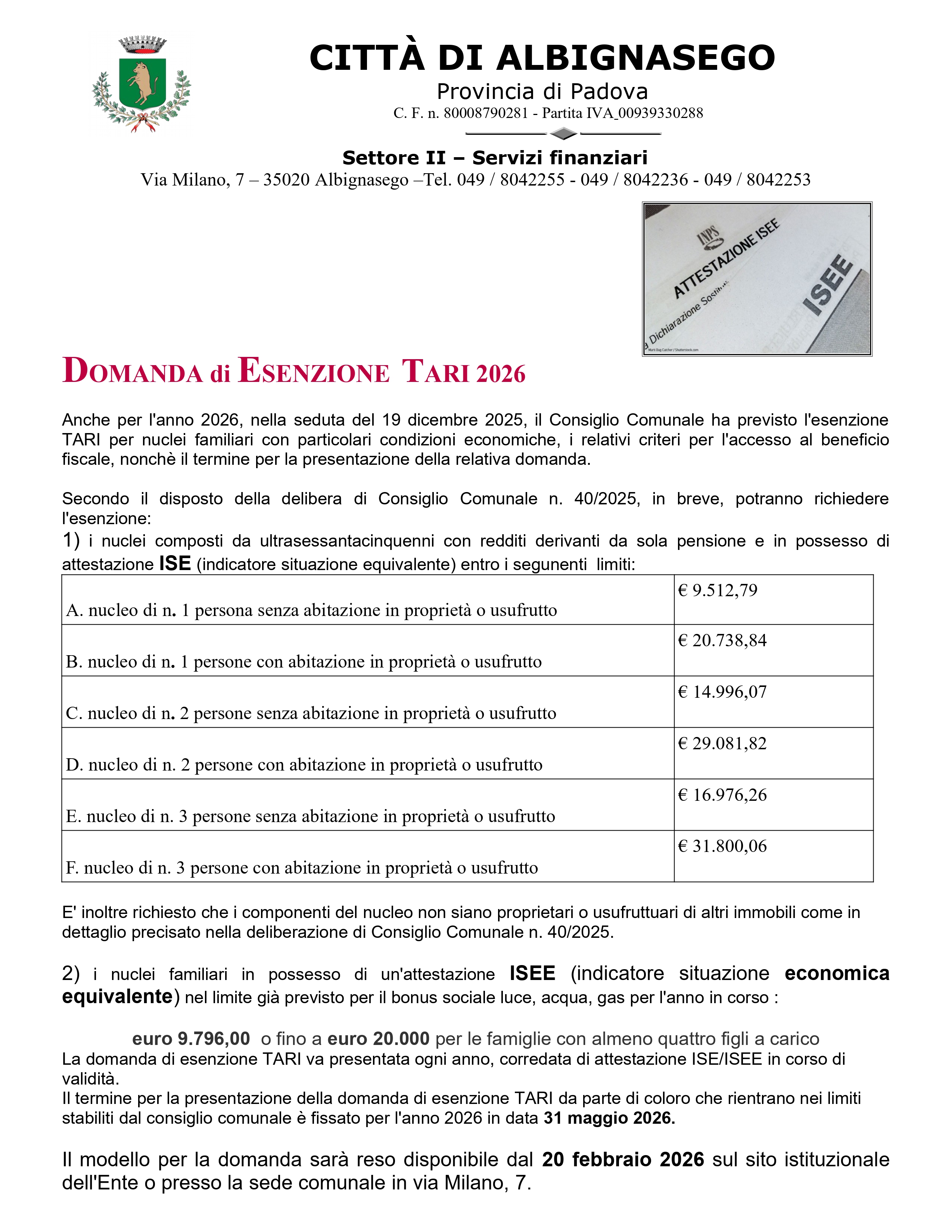 Anche per l'anno 2026, nella seduta del 19 dicembre 2025, il Consiglio Comunale ha previsto l'esenzione TARI per nuclei familiari con particolari condizioni economiche, i relativi criteri per l'accesso al beneficio fiscale, nonchè il termine per la presentazione della relativa domanda.