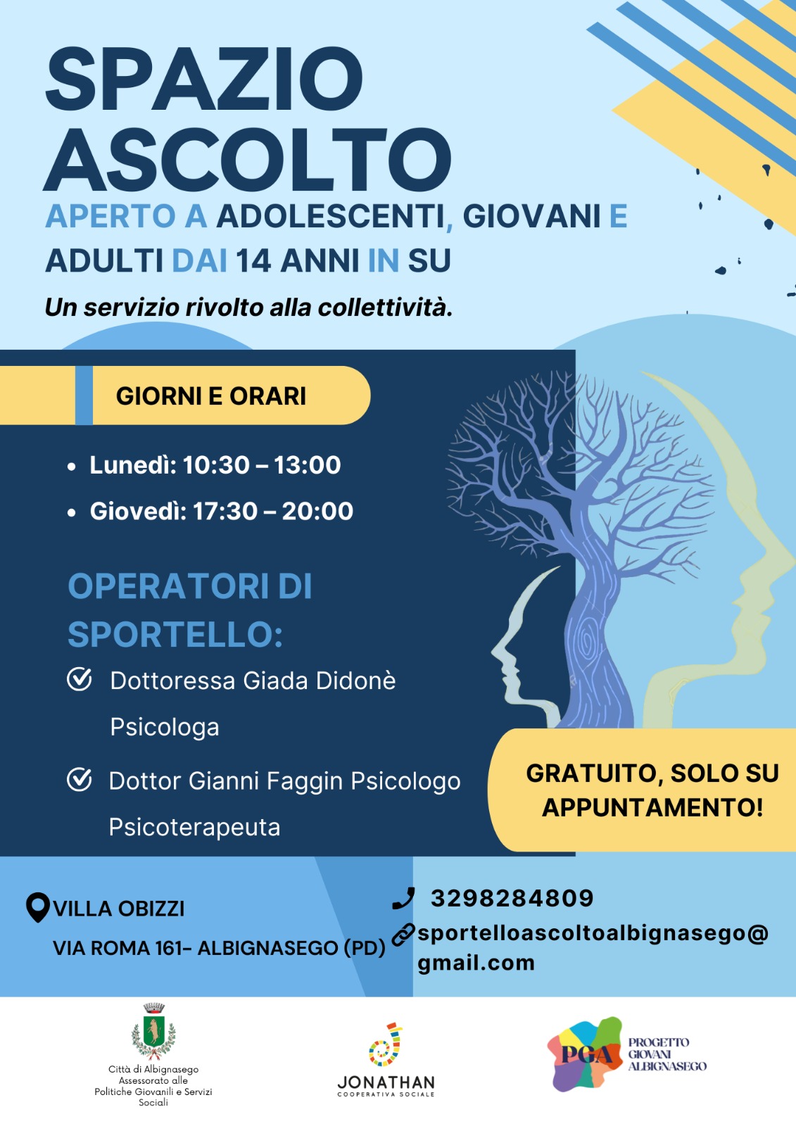 È stato approvato dalla Giunta comunale il progetto “Sportello Psicologico Albignasego”, un nuova e significativa iniziativa rivolta al benessere dei cittadini, con l’obiettivo di offrire uno spazio di ascolto e supporto accessibile a partire dai 14 anni e senza limiti di età. Il servizio sarà gestito da psicologi e psicoterapeuti esperti di Jonathan Cooperativa Sociale, con esperienza nella prevenzione e nel sostegno del disagio psicologico, sia in adolescenza sia in età adulta.